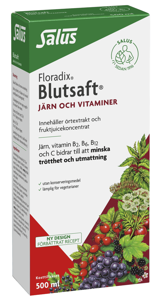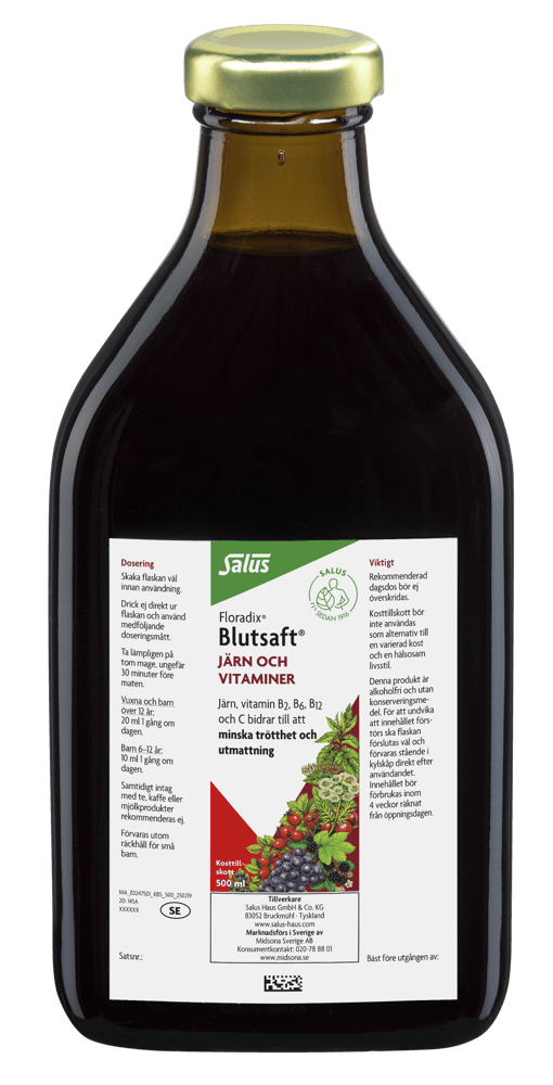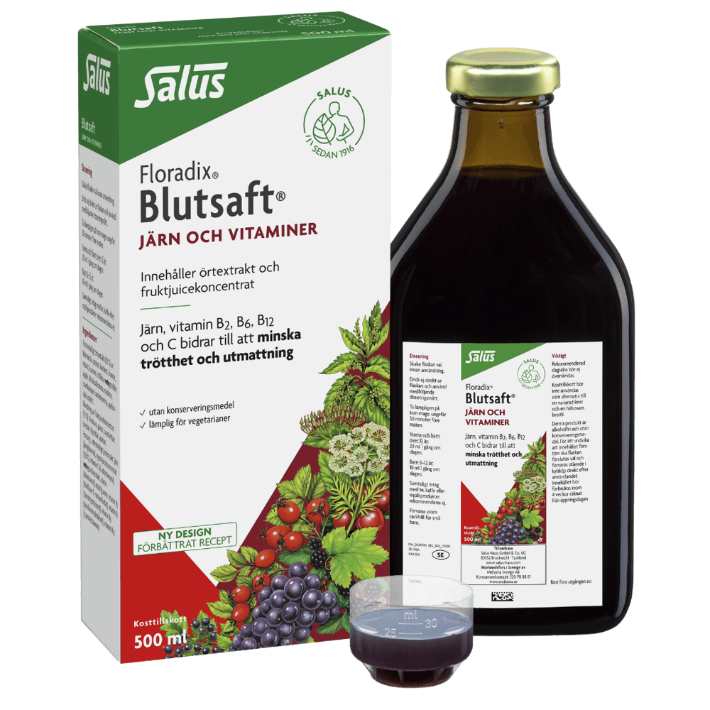 Floradix Blutsaft® flytande järn och vitaminer är ett kosttillskott som innehåller en organisk och lättabsorberad typ av järn - järnglukonat. Blutsafts järntillskott innehåller även örtextrakt, B-vitaminer samt C-vitamin i form av fruktjuicer som bidrar till att förbättra upptaget av järnet. Järn bidrar till att minska trötthet och utmattning